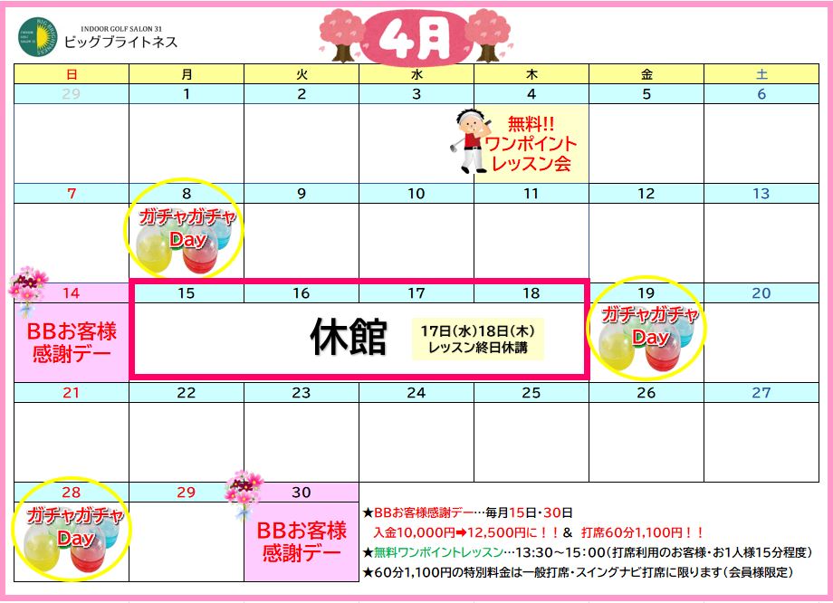 休館に伴い、15日のBBお客様感謝デーは14日(日)に、18日のガチャガチャデーは19日(金)に変更となります。