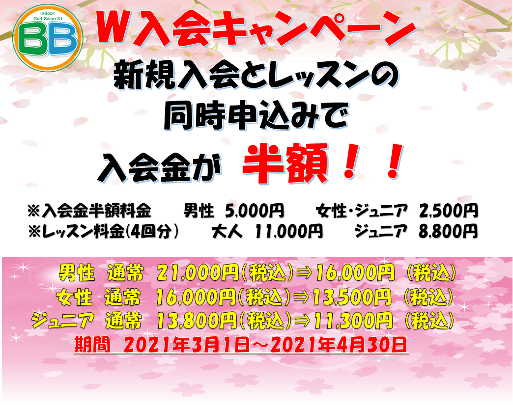 レッスン入会と、新規入会の同時申込で、入会金を半額にいたします。